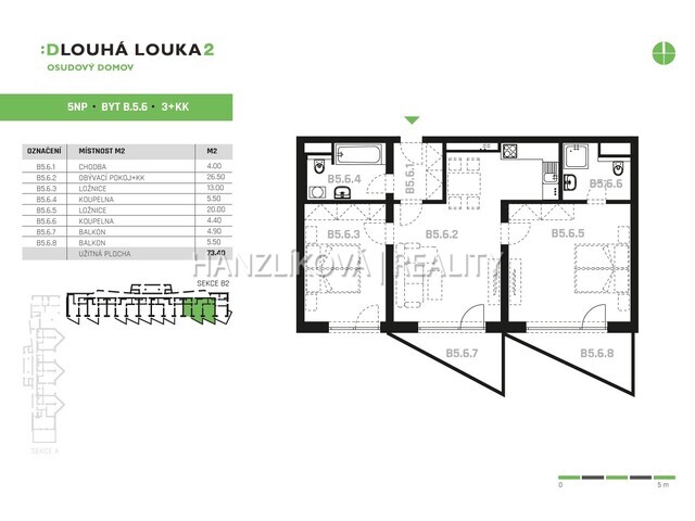 Pronájem nadstandardního bytu 3+kk (B.5.6) se dvěma balkony, rezidence DLOUHÁ LOUKA 2.etapa